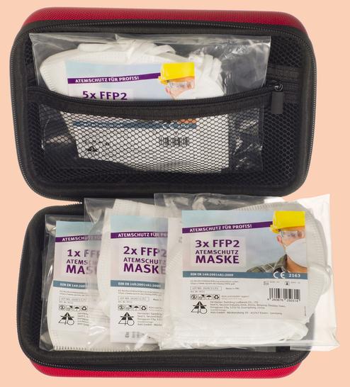 Sie mal mit Ihrem(r) Partner(in) verreisen wollen, dann können Sie 2, 3 oder sogar 4 Sets mit FFP2-Masken in diese stabile und knallrote Reisebox packen. Sie hat ein Format von 20,0 x 13,5 x 7,0 cm und ist ab 200 Stück erhältlich.