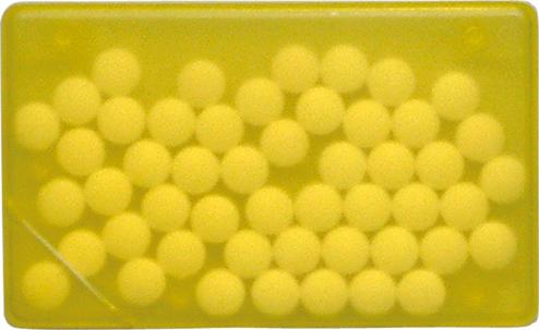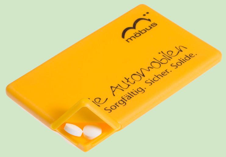 Die vom HGH Card & Care Service angebotene PeppermintCard 2side ist etwas kleiner als eine originalgroße Scheckkarte, hat aber abgerundete Ecken und enthält 50 zuckerfreie weiße Pfefferminzpastillen, die einzeln aus eine klappbaren Ecke herausgespendet werden.