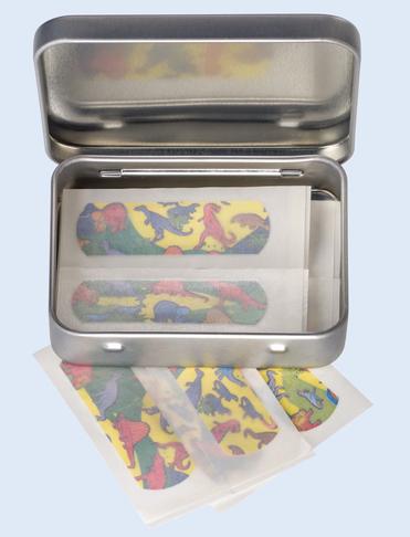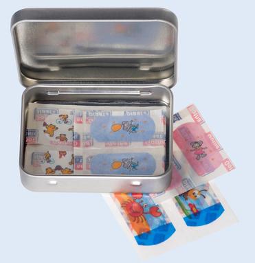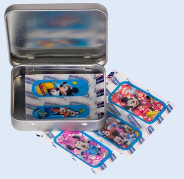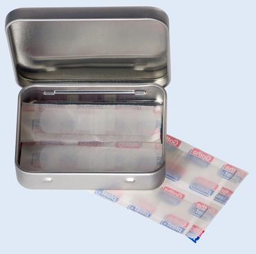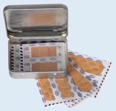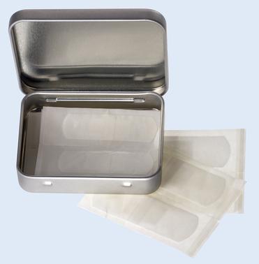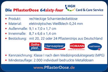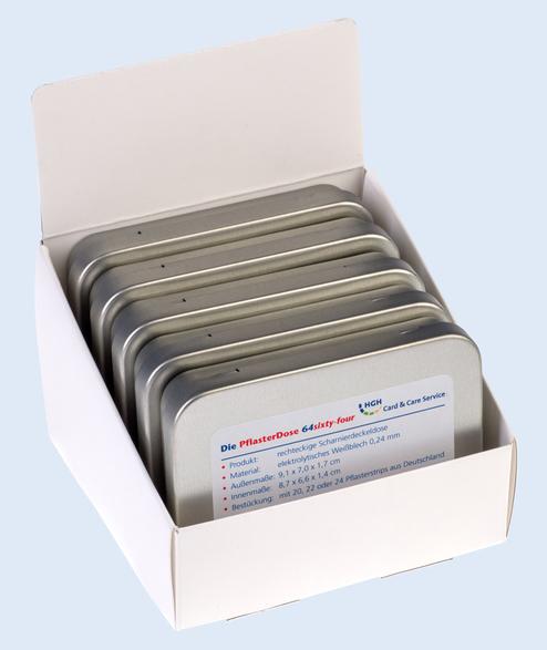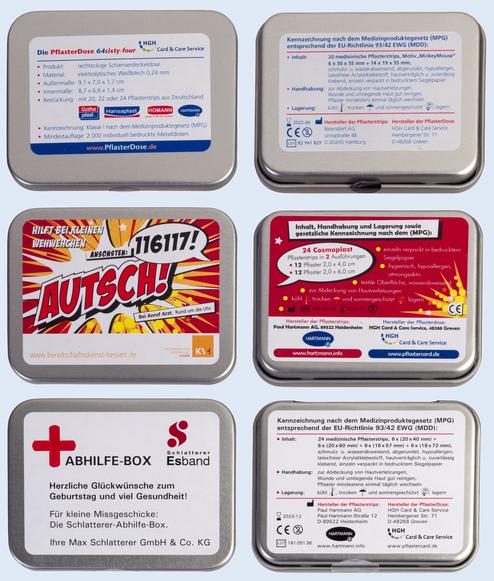 Zusätzlich zu den vielfältigen Produktvarianten der Original-PflasterCard® produziert der HGH Card & Care Service auch eine PflasterDose aus Metall mit einer Bestückung, die der Kunde frei wählen kann.