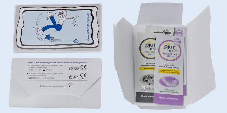 - Freiraum für 2 Gleitgelsachets in quadratischer Siegelfolie.