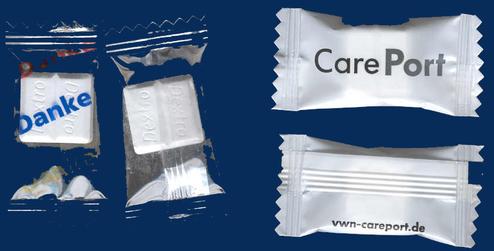 Besonders farbenfrohe Werbung können Sie mit den bunten Zuckersticks in transparenter Folie machen. Diese gibt es vielen Farben und mit folgendem Inhalt: