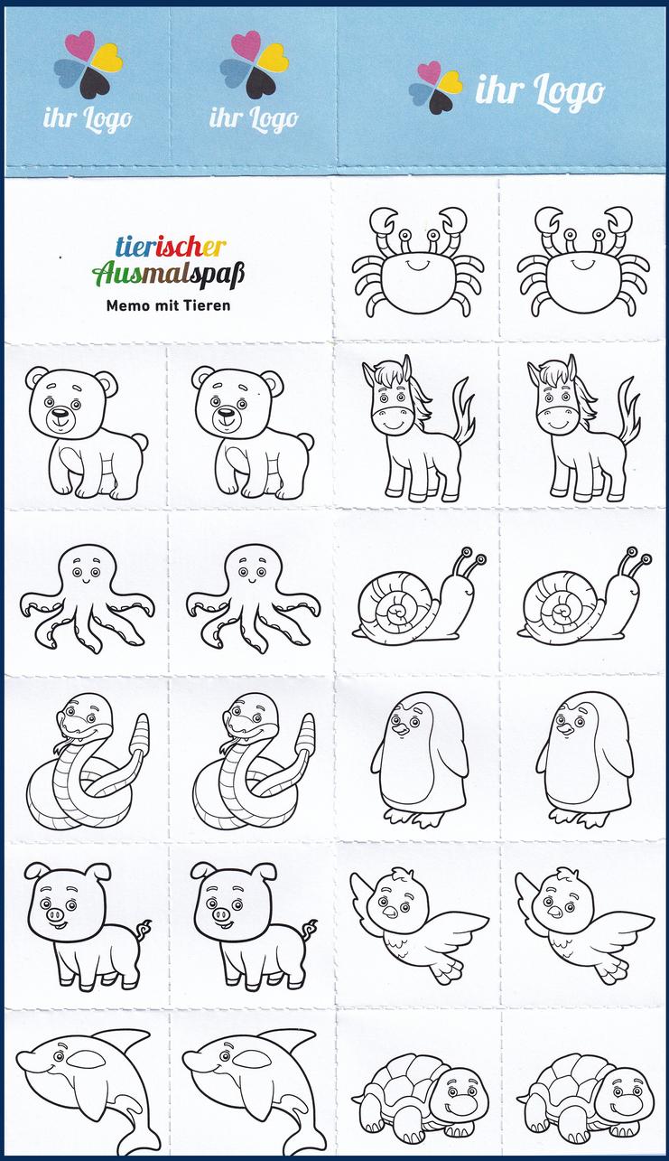 Die im Set enthaltenen 26 Memory-Kärtchen sind mit schwarzer Umrandung und Tiermotiven vorgedruckt. Sie können ganz nach der Vorstellungskraft und Fantasie der Kinder ausgemalt werden. Danach werden alle Memo-Kärtchen auf den Tisch gelegt und das Memory-Spiel kann beginnen.