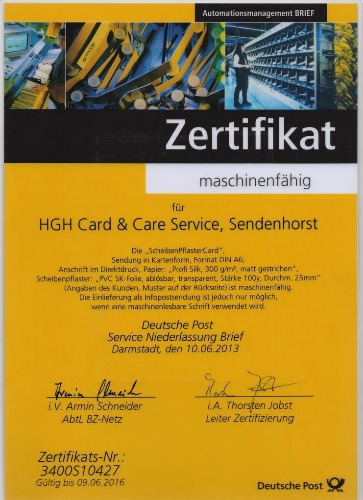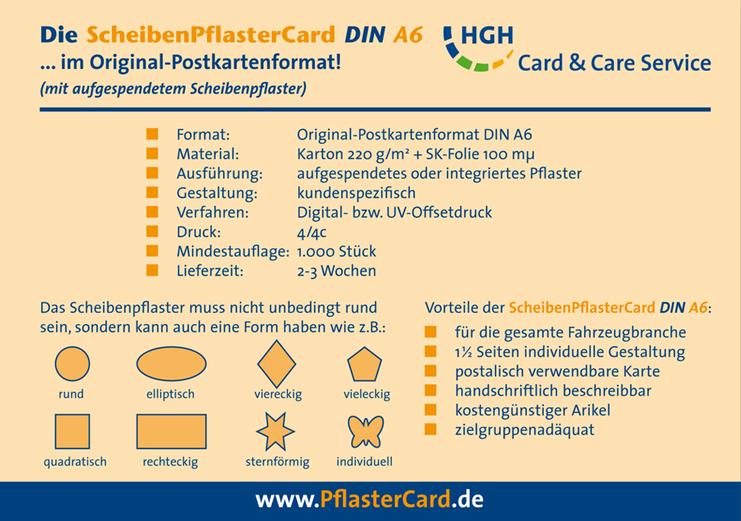 Wenn viel Platz für Fotos und/oder Text benötigt wird, so ist ScheibenPflasterCard DINA6 des HGH Card & Care Service genau das richtige Werbemedium. Sie eignet sich als Mailingbeilage (zur späteren Beschriftung durch den Beschenkten) und besonders gut als (bereits bedruckter) SelfMailer. In letzterem Fall läßt sich die Postkarte natürlich auch personalisieren, ganz nach dem Motto: „Offset-Druck meets Digital-Druck!“