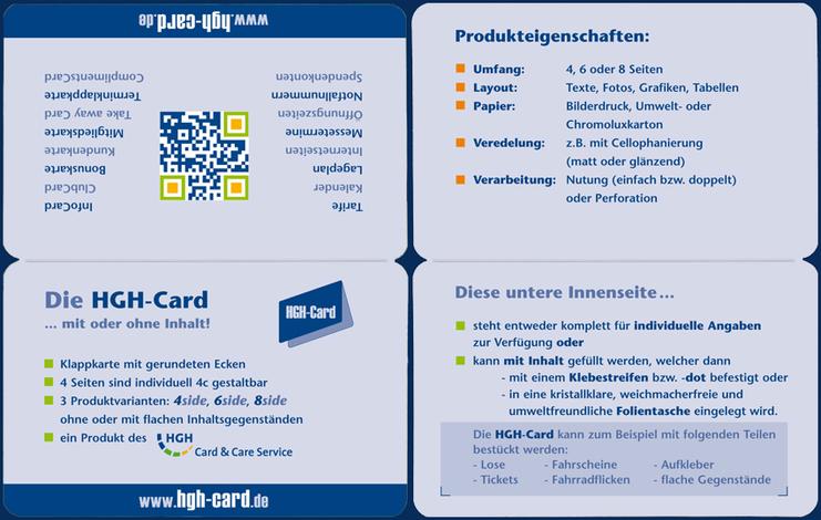 Eine Klappkarte mit geschnittenen oder gestanzten Rundecken im Original-Scheckkartenformat - das ist die HGH-Card 4side! Alle 4 Seiten können ganz nach Ihren Vorstellungen und Ihrem Kommunikationsauftritt gestalten werden.