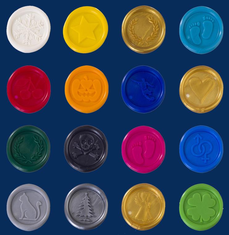 Die PE-Wachssiegel werden auf einer von Ihnen frei wählbaren Position auf der SealCard manuell aufgespendet. Auch mehrere Siegel sind auf der Postkarte möglich. Eine große Auswahl an Standard-Siegelmotiven in verschiedenen Farben steht Ihnen zur Verfügung wie z.B.: