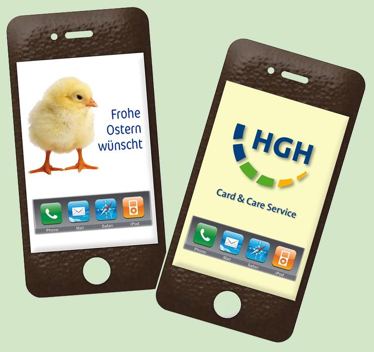 Passend zur schööönen HandyCleanerCard bietet der HGH Card & Care Service noch das eßbare LebkuchenPhone an. Dieses Produkt ist zum Anbeißen! Es hat das Design eines Smartphones und die individuelle 4c-Gestaltung auf der Marzipanplatte eröffnet Ihnen gaaaanz viele Möglichkeiten für Produktdesign und Werbeaussagen.