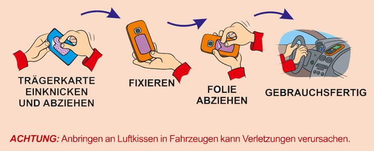 Die feingenoppte Oberfläche des 5,2 x 2,5 cm großen Pads aus Soft-PVC bietet eine rutschfeste Befestigung des Handys oder Smartphones. Zum Gebrauch werden die „Anti-Rutsch-Sticker“ einfach auf die Rückseite des Handys geklebt. Mit Hilfe dieses „MobileGrippers“ kann das Handy dann auf glatte Oberflächen (wie z.B. Autoarmaturen) abgelegt werden, ohne daß es verrutscht.