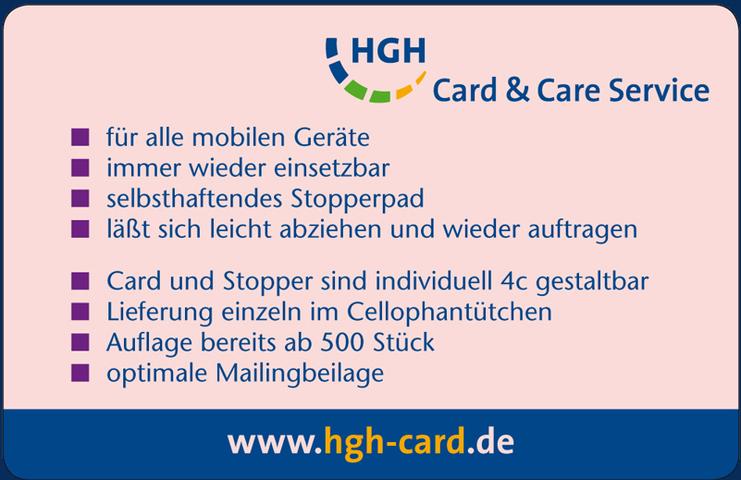 Die HandyStopperCard des HGH Card & Care Service ist das passende Pendant zur HandyCleanerCard. Zusammen bilden sie ein ideales Pärchen! Als KombiSet sind sie das perfekte Duo in einem Folder.