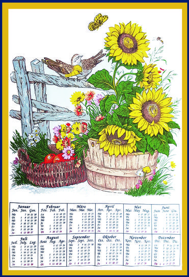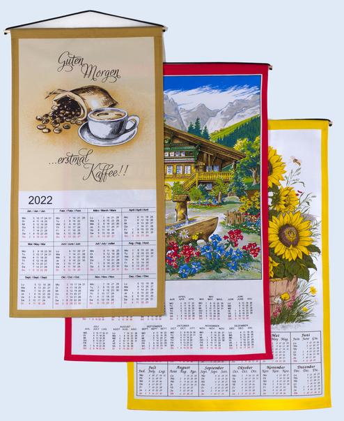 Die textilen Wandkalender werden hier regional im Münsterland bedruckt plus konfektioniert und haben eine Mindestauflage von 300 Stück bei Standardmotiven und 500 Stück bei kompletter Eigengestaltung. Wenn das Jahr abgelaufen ist, kann das Tuch weiter ganz im Sinne der Nachhaltigkeit für die verschiedensten Zwecke weiter benutzt werden: vom Handtuch bis zum Putzlappen.
